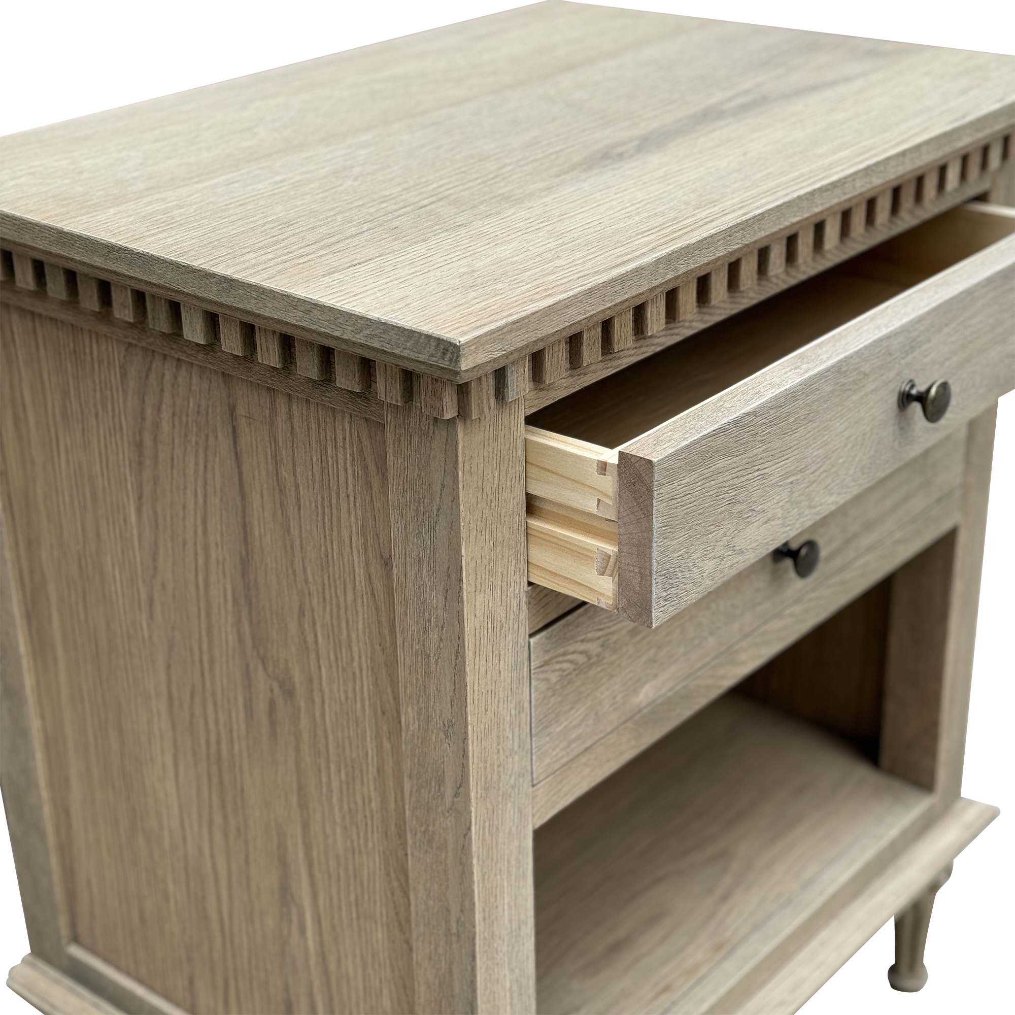 - Mortise-and-tenon joinery and dovetail drawers with timber runners